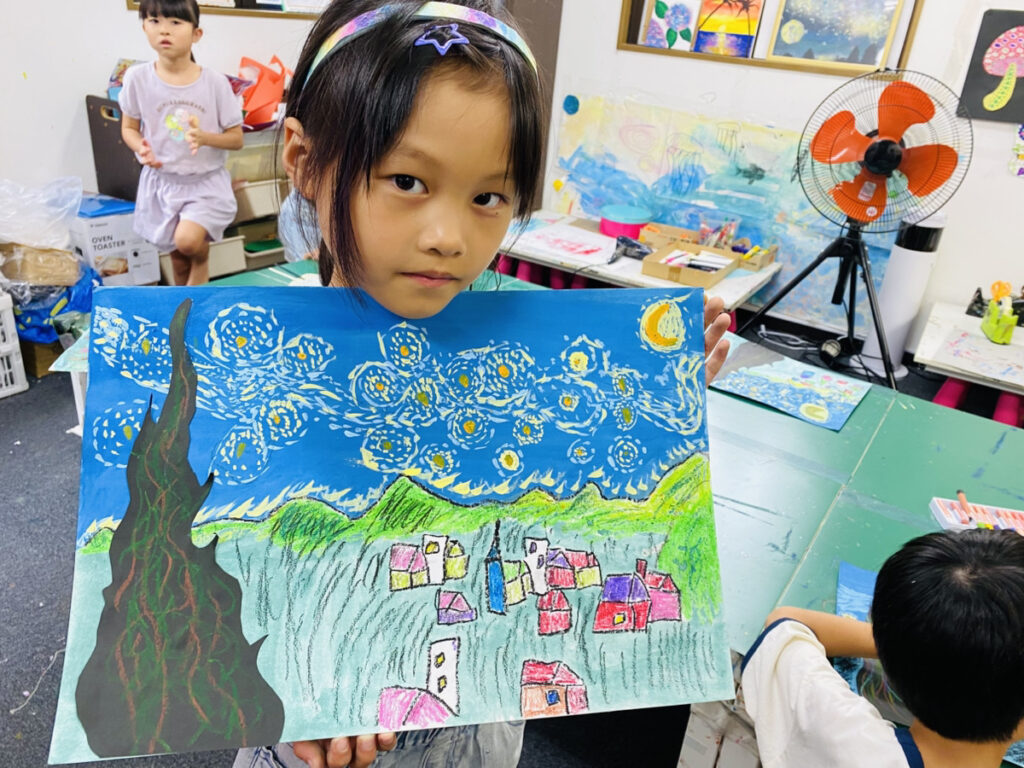 ゴッホの代表作「星月夜」を子供達でもかんたんに描ける油絵風に!