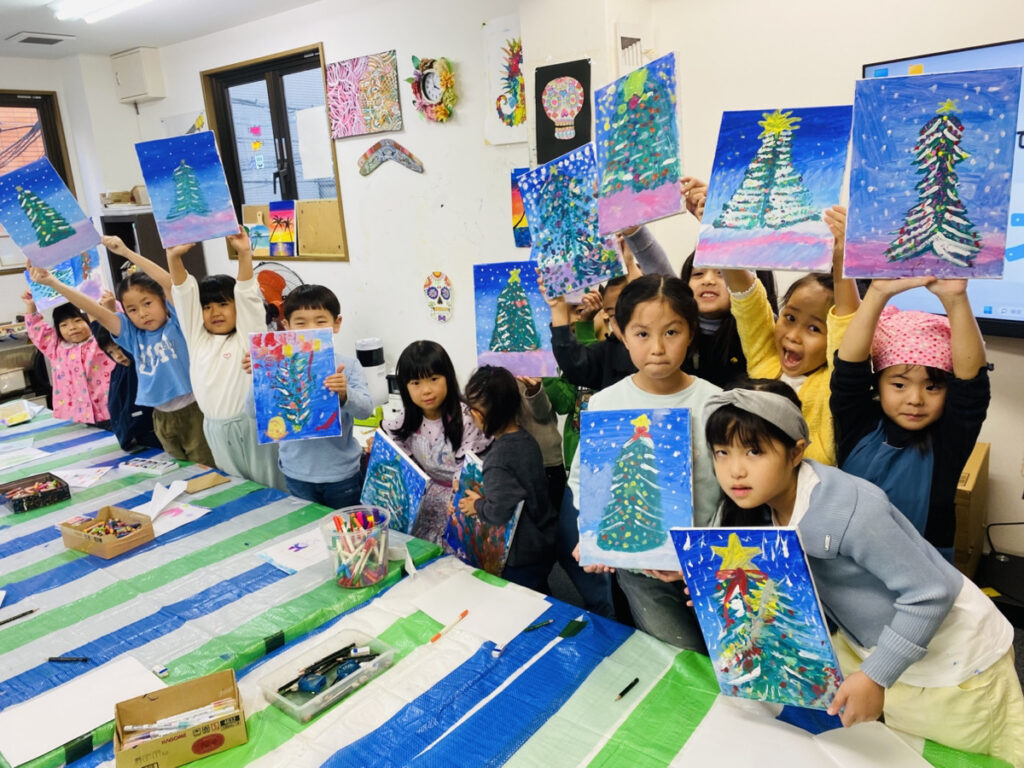 クリスマスツリーをキャンバスに描きました!子供でも簡単なアクリル絵の具画