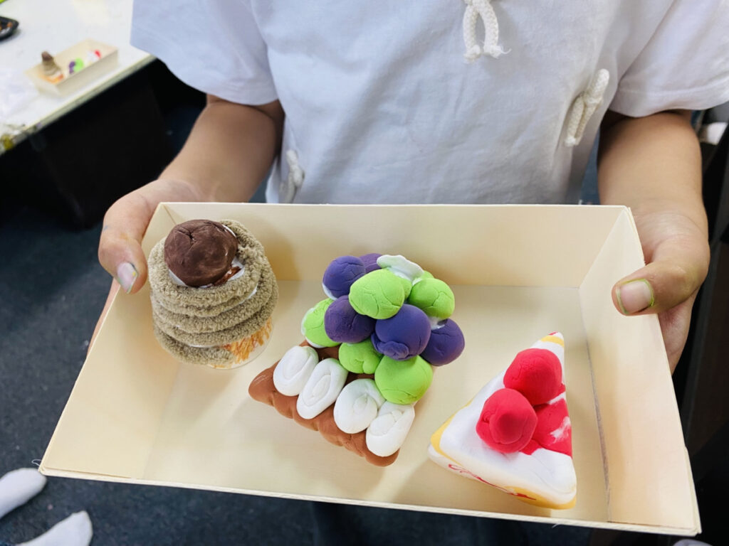 蓋つきのクリアケースを海の世界に見立て、まずは海の底からつくます!紙粘土やビーズを使い太陽の光で反射しているような海底に!クリアシートに海藻やサンゴを描き海底に差し込みます。全面には宝石シールにヒレなどを描きキラキラの魚を表現!(たこやクラゲなどいろんな海の生き物をつくりました)レイヤーにすることで奥行のある美しい海の世界を表現いただきました!光が当たるとキラキラと輝く宝石のような海の生き物です!▼