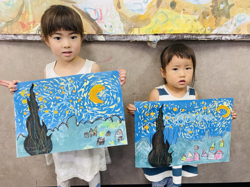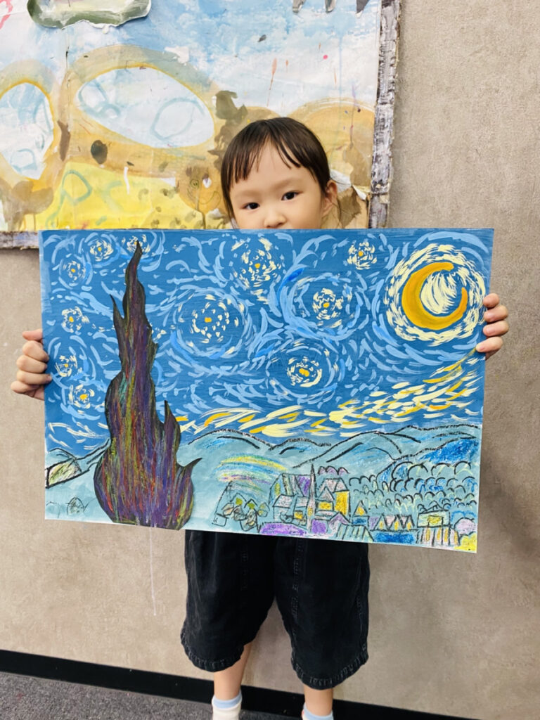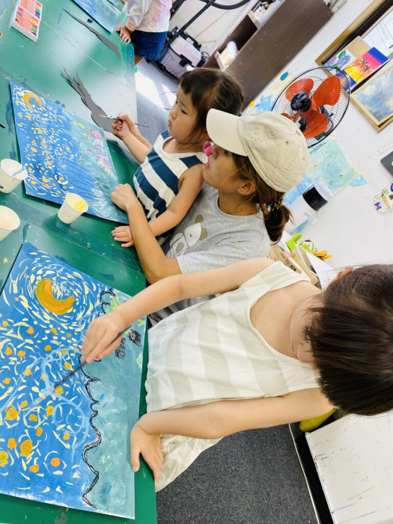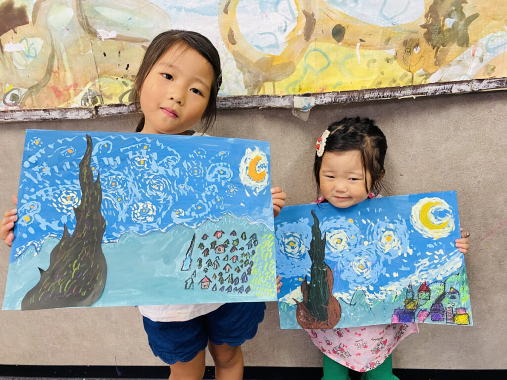 「星月夜」は、ひまわりと同様ゴッホの代表作のひとつで、療養中の病院の部屋から描いた美しい星や景色が有名です。渦をまいた空や、実際には存在しない馴染みのある教会、生と死を連想させる糸杉などゴッホの内面、精神世界を強く反映した作品です。繊細に重なる筆跡のこるペイントなど、子供たちにとっては挑戦となるテーマでしたがみんなそれぞれ異なる素晴らしい作品となりました!