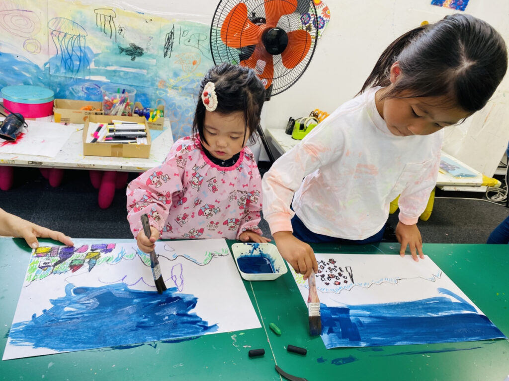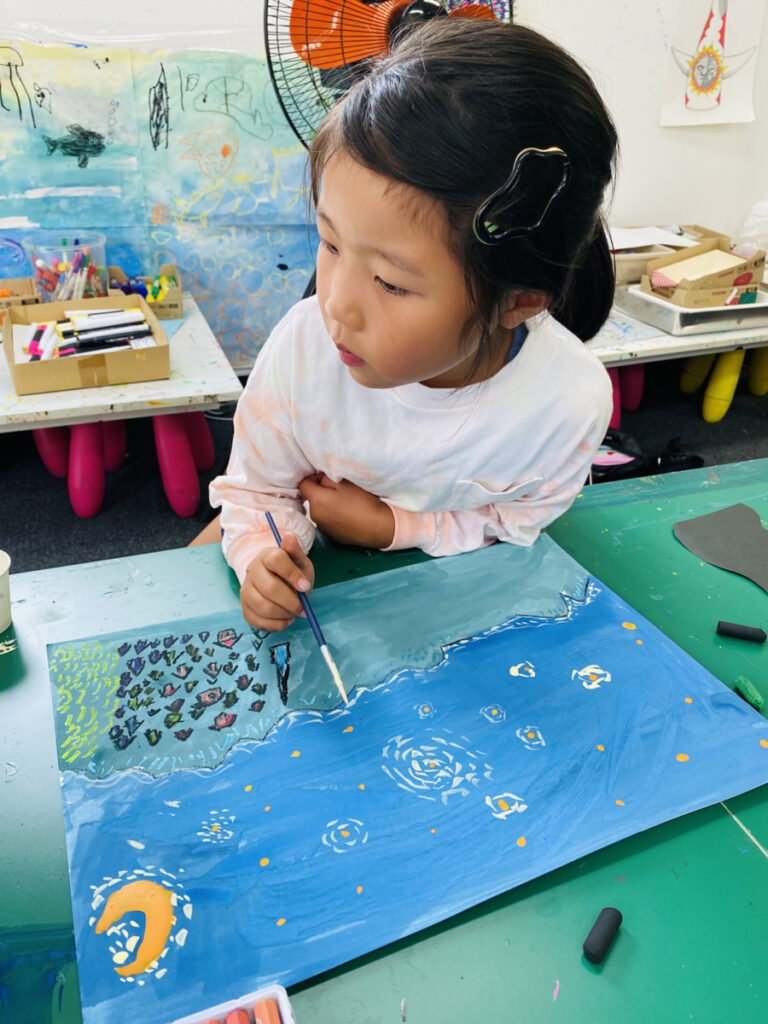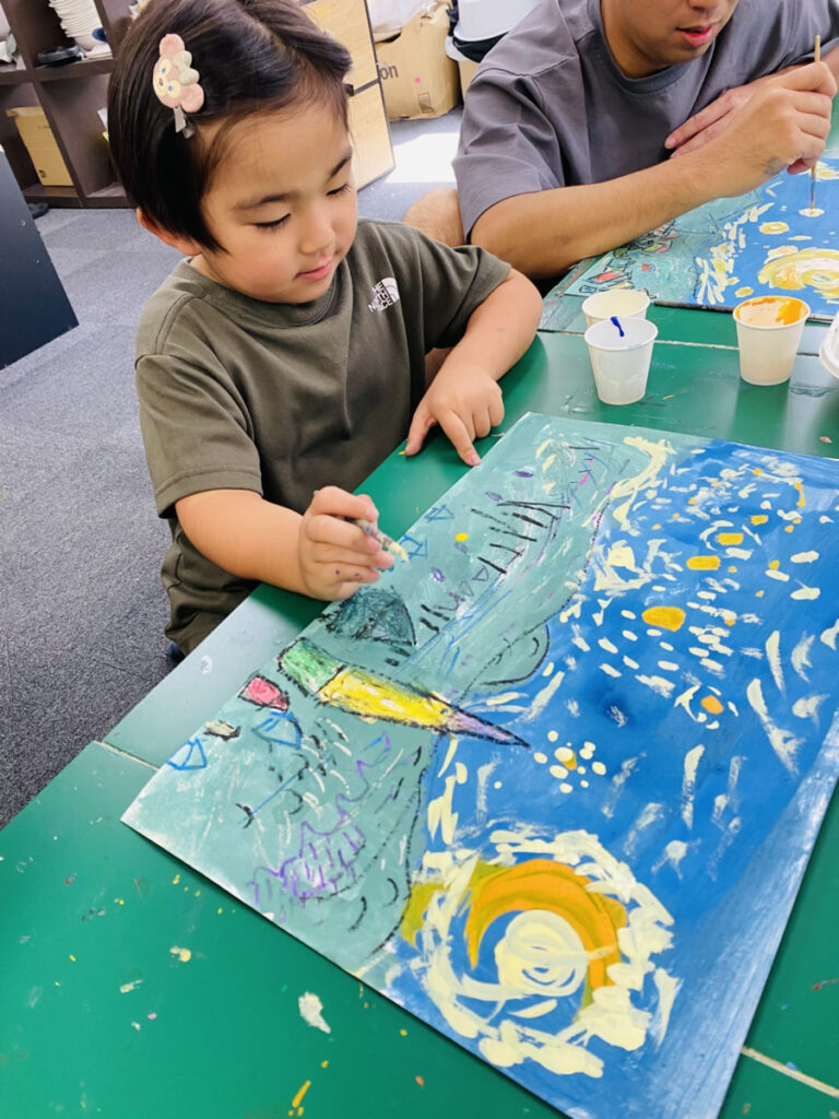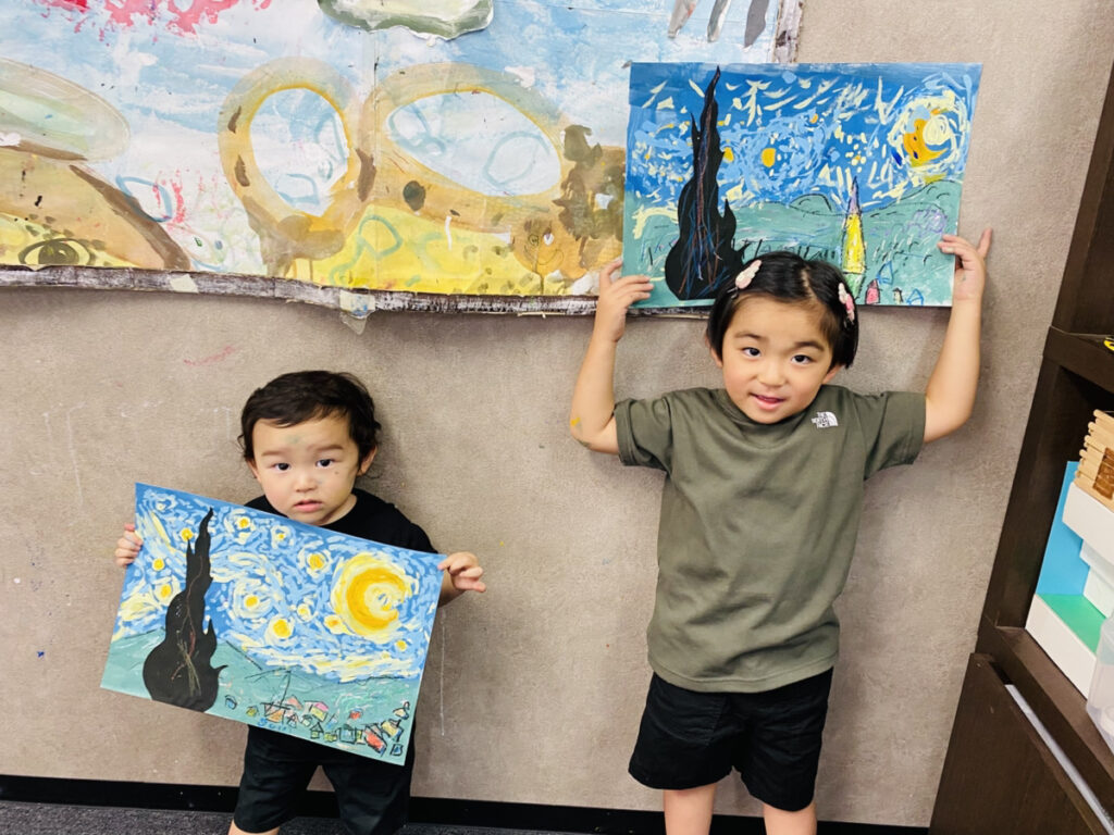 「星月夜」は、ひまわりと同様ゴッホの代表作のひとつで、療養中の病院の部屋から描いた美しい星や景色が有名です。渦をまいた空や、実際には存在しない馴染みのある教会、生と死を連想させる糸杉などゴッホの内面、精神世界を強く反映した作品です。繊細に重なる筆跡のこるペイントなど、子供たちにとっては挑戦となるテーマでしたがみんなそれぞれ異なる素晴らしい作品となりました!