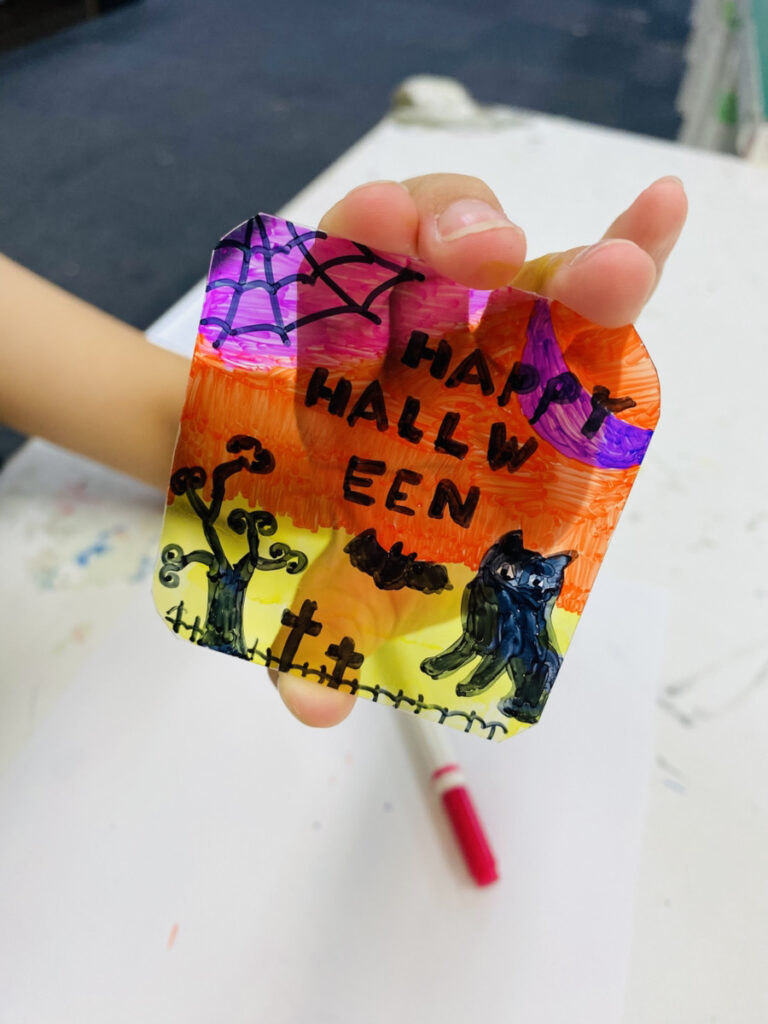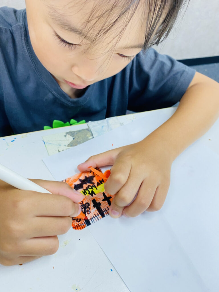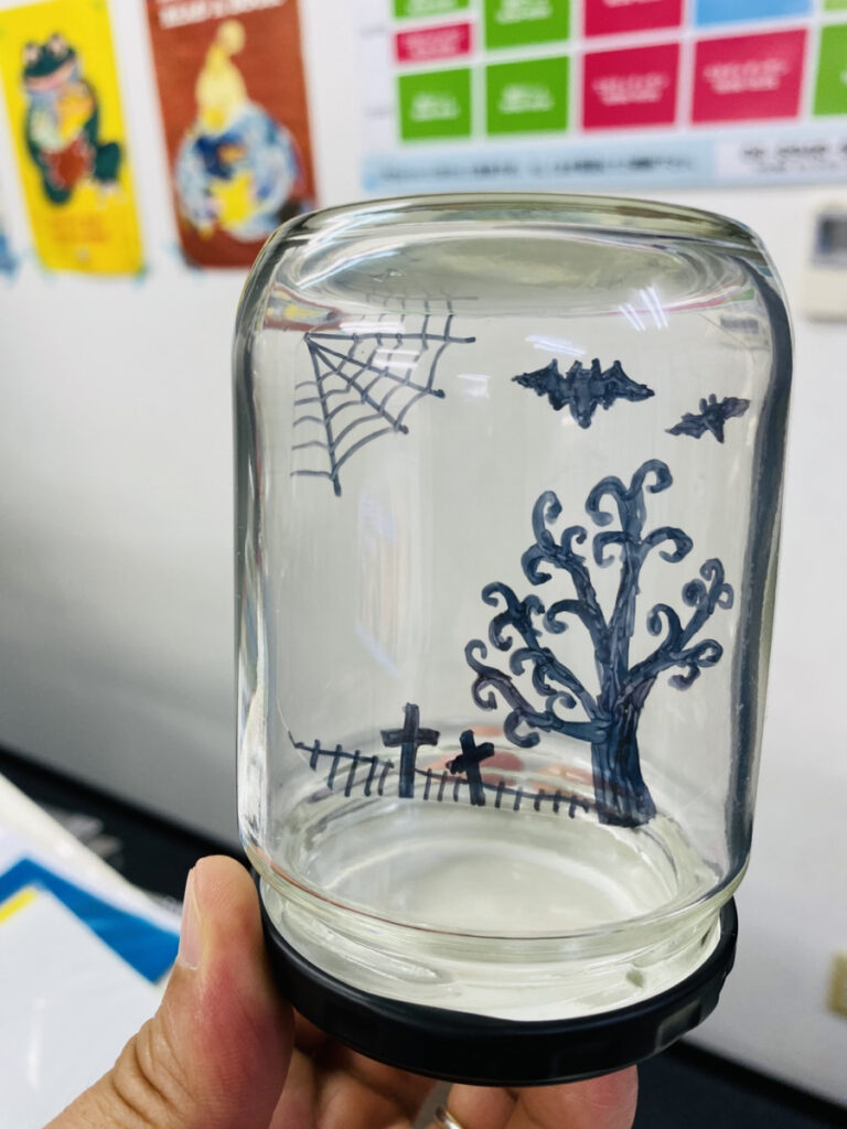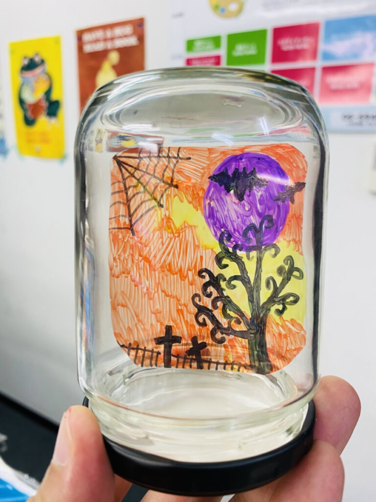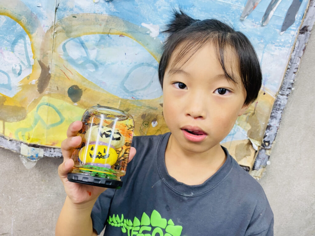 10月のイベントといえばハロウィン!おうちで過ごすハロウィンイベントをもっと楽しく!子供たちに飾って楽しい「手作りハロウィンスノードーム」に挑戦いただきました!最初に背景作りからスタート!コウモリや月などハロウィンナイトの雰囲気たっぷりに描きます。かぼちゃのオーナメントに顔の模様を描いてオリジナルのジャックオーランタンに!ビンのフタの内側にかぼちゃを重ねてグルーガンで固定します。お好みのラメやハロウィンスパンコールなどをいれて、今回は洗濯のりと水をビンの中にいれました!ライトで照らすとハロウィンの雰囲気たっぷりに暗闇でも楽しめそうです!▼