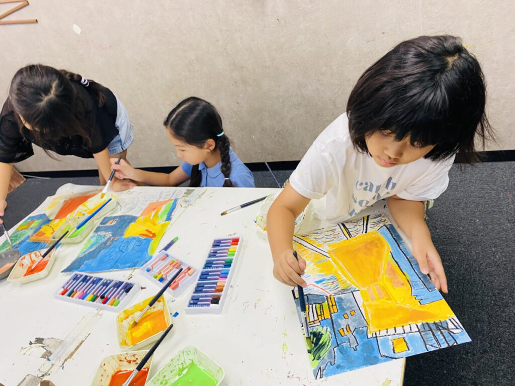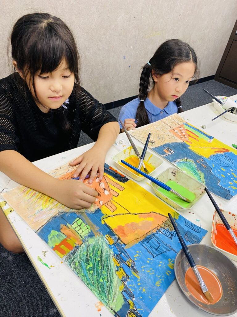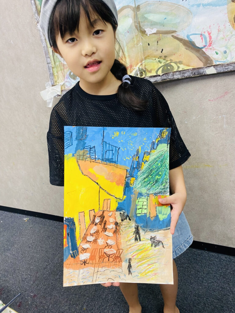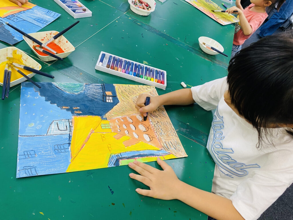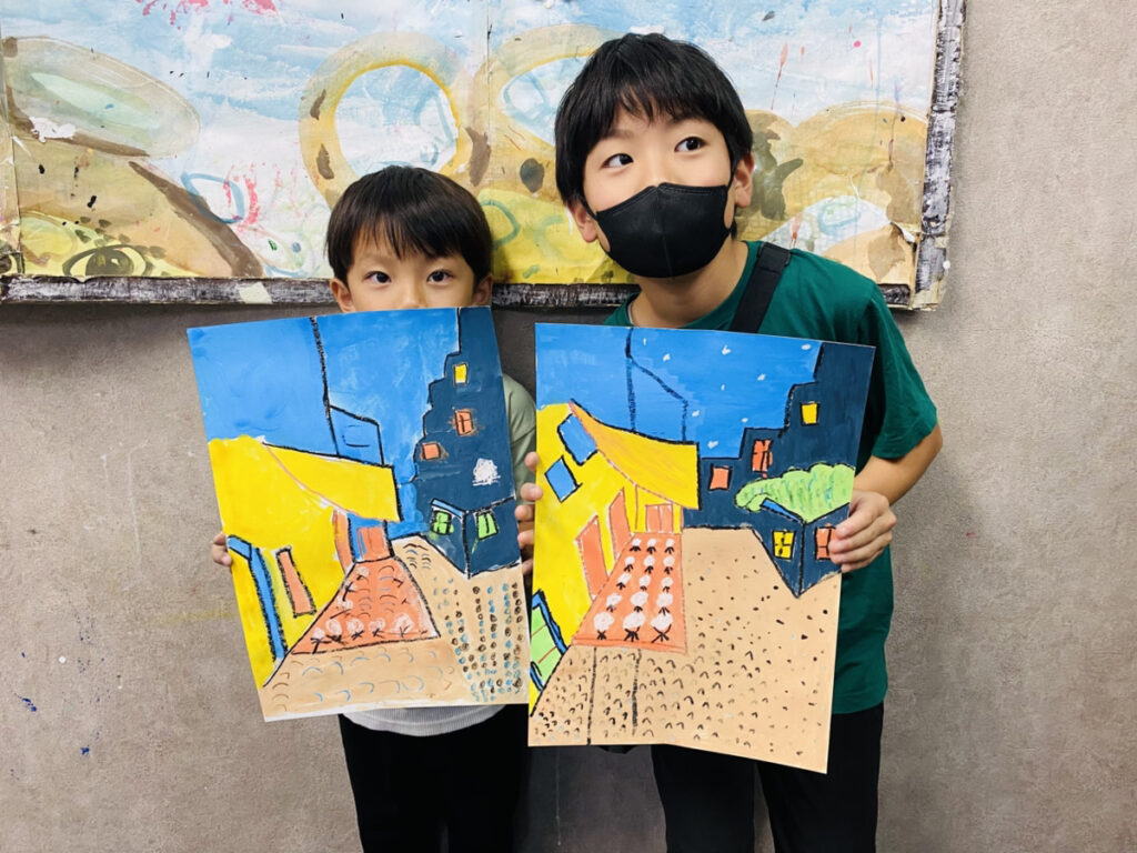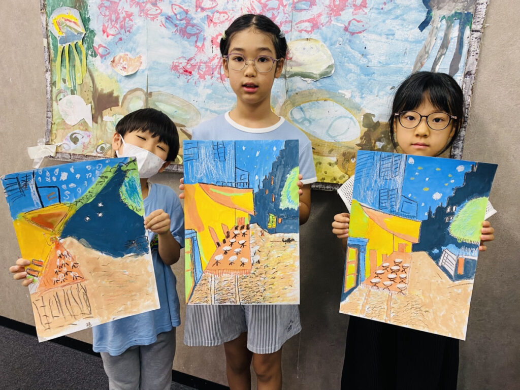 ゴッホの代表作『夜のカフェテラス』の油絵風の描き方に挑戦いただきました!簡単だけど本格的なゴッホのお絵描きを子供たちに体験いただきました!