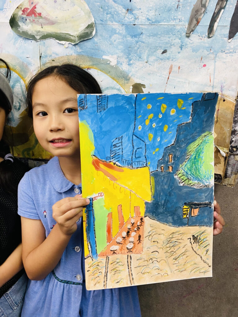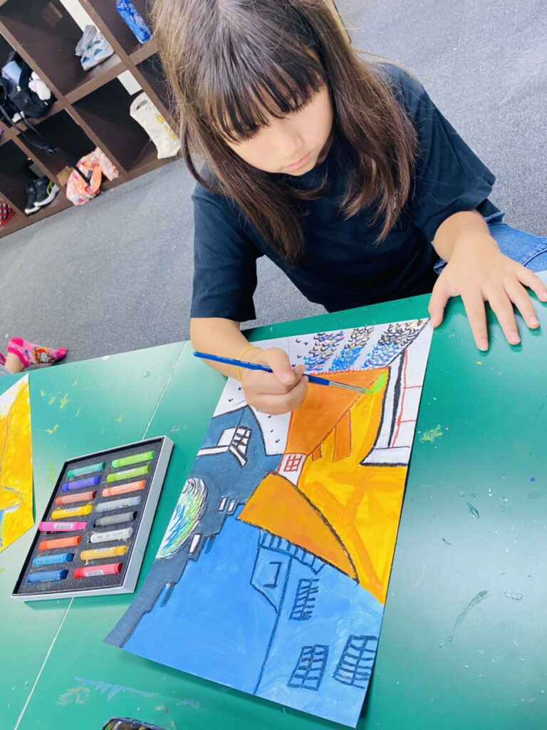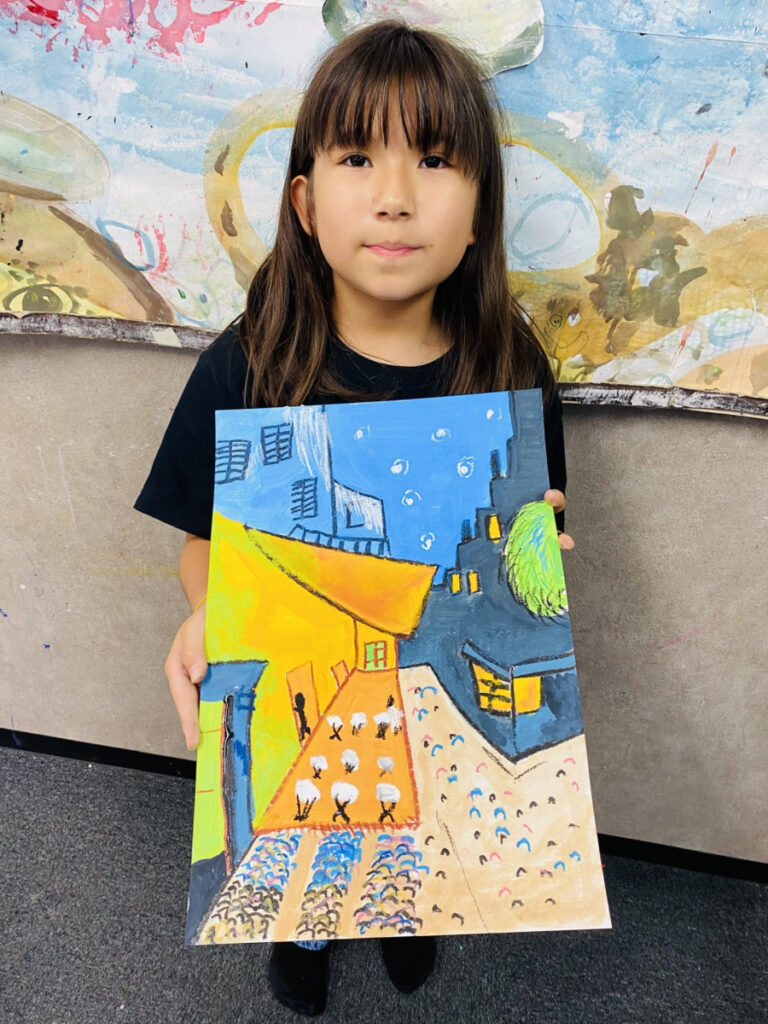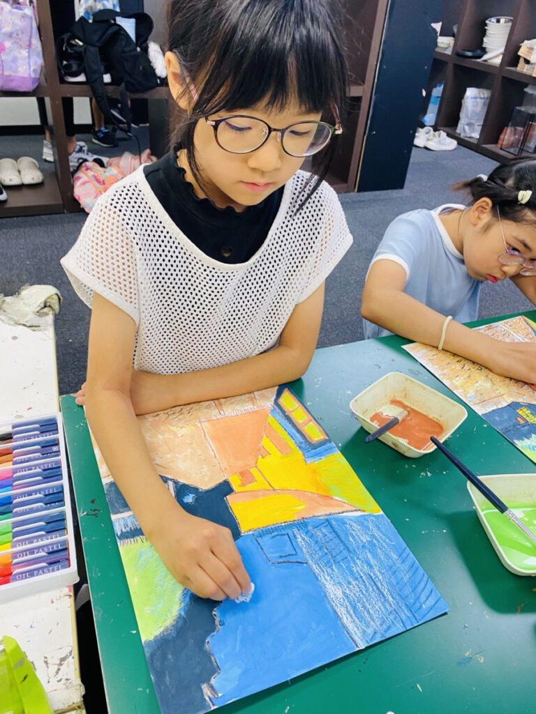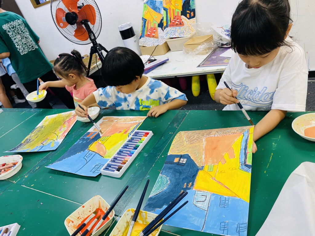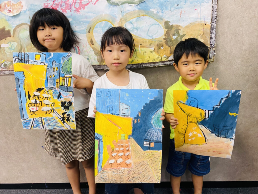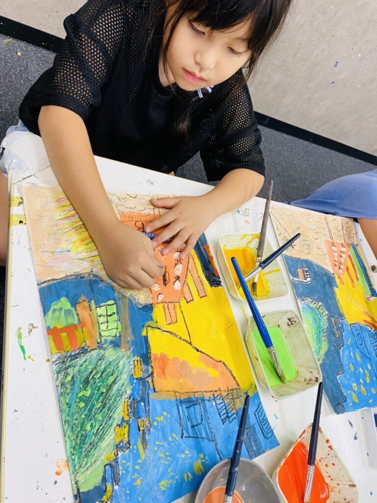 ゴッホの代表作『夜のカフェテラス』の油絵風の描き方に挑戦いただきました!簡単だけど本格的なゴッホのお絵描きを子供たちに体験いただきました!