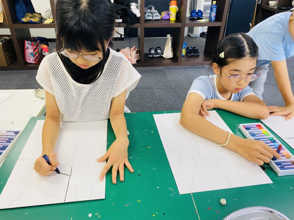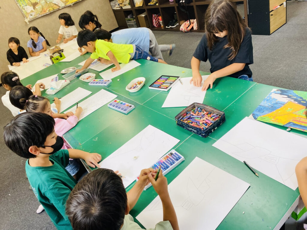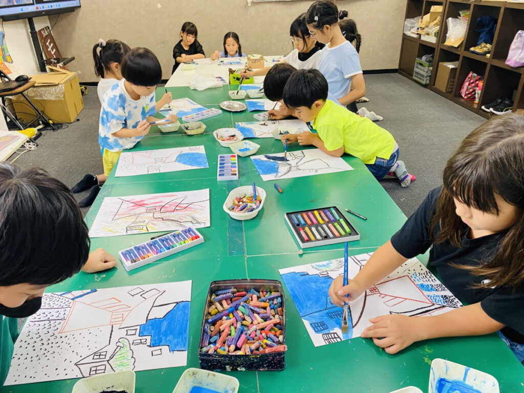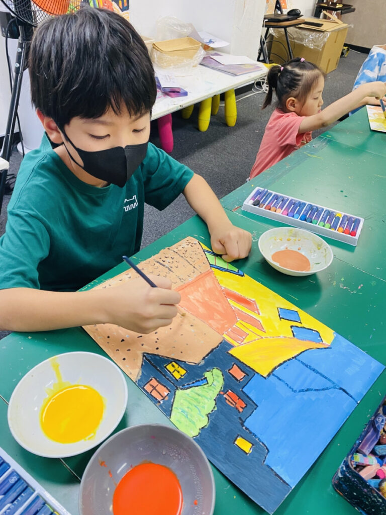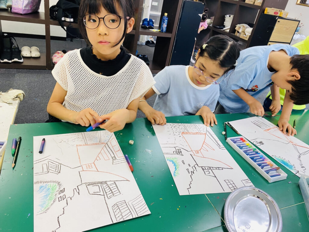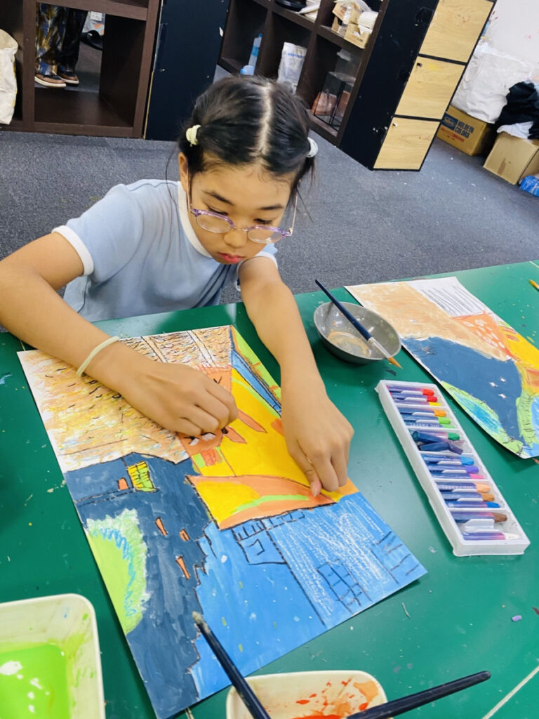 ゴッホの代表作『夜のカフェテラス』の油絵風の描き方に挑戦いただきました!簡単だけど本格的なゴッホのお絵描きを子供たちに体験いただきました!