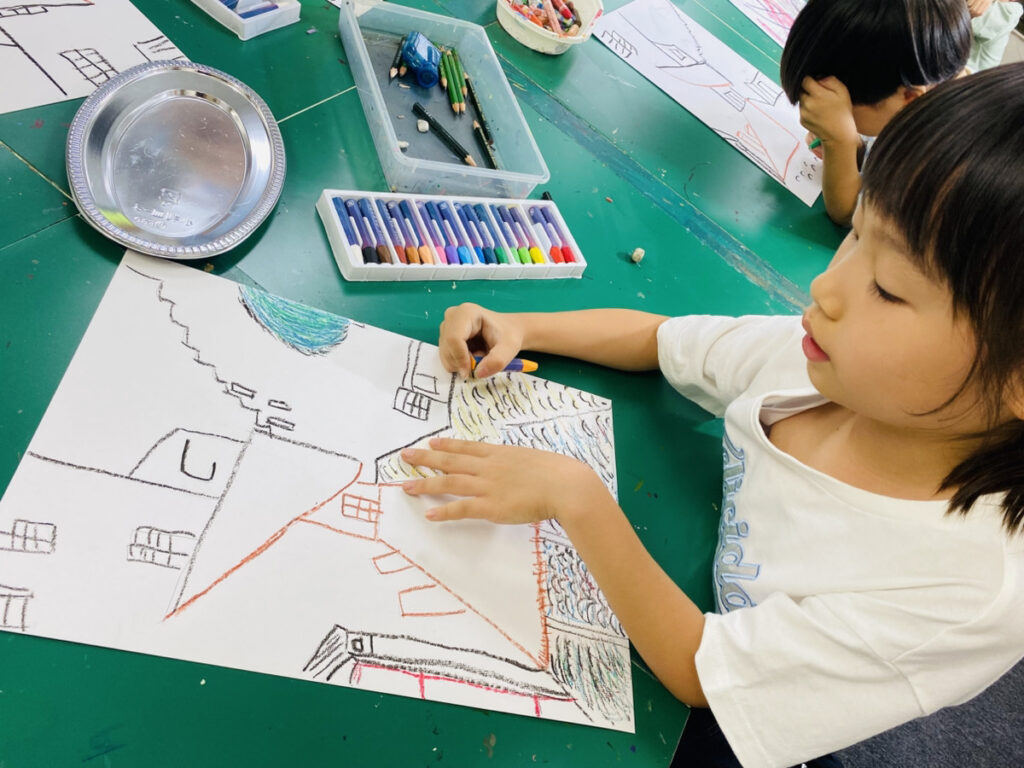 ゴッホ特有の強いアウトラインはクレパスで、絵の具とクレパスを塗り重ねます。「この窓は何のためにあるんやろ」「地面は石ででこぼこやね!溝は雨水を流すためかなぁ」など絵の世界に入りこんでいただきイメージを膨らませながら描いていただきました!椅子や人は最後に描いて見事完成です!▼