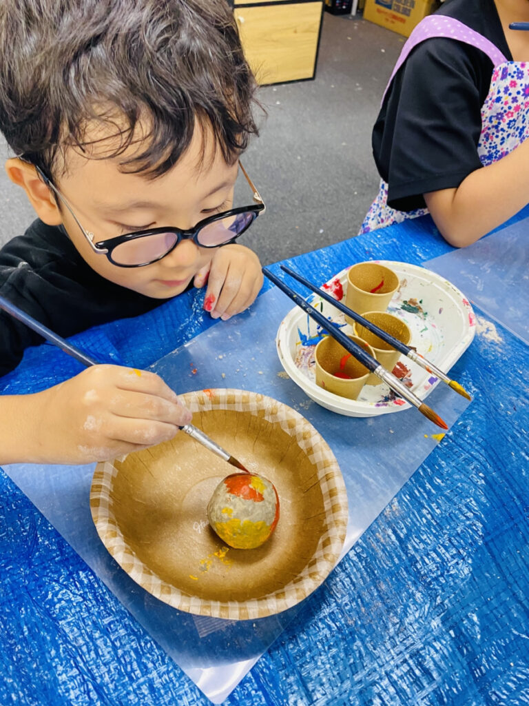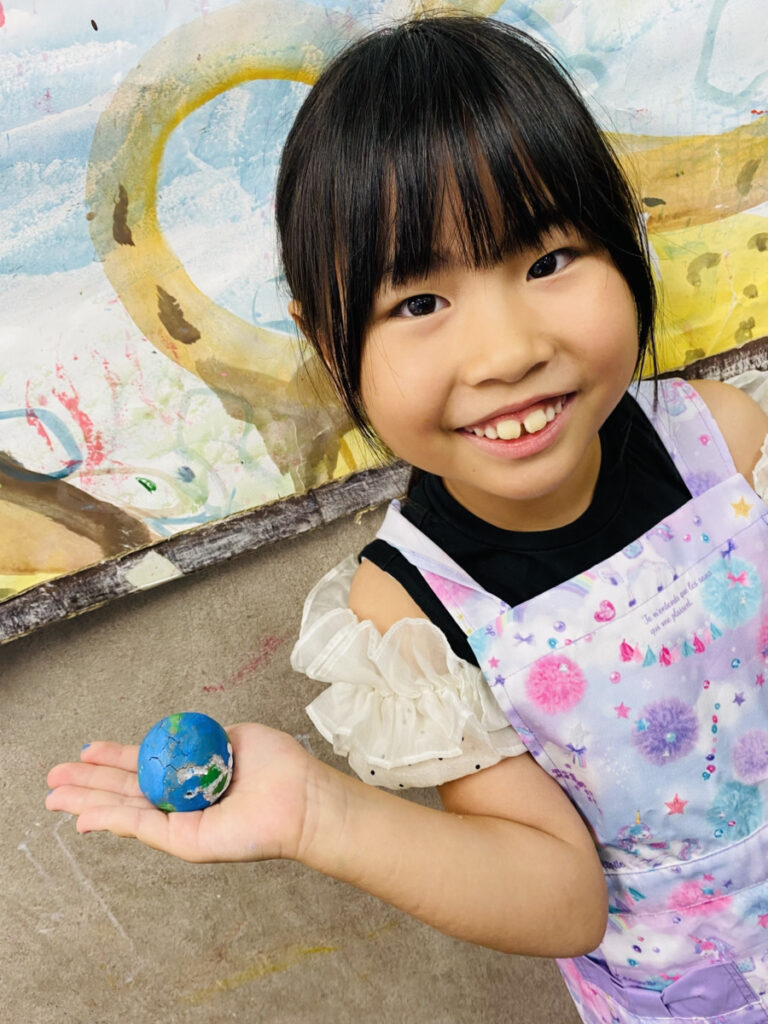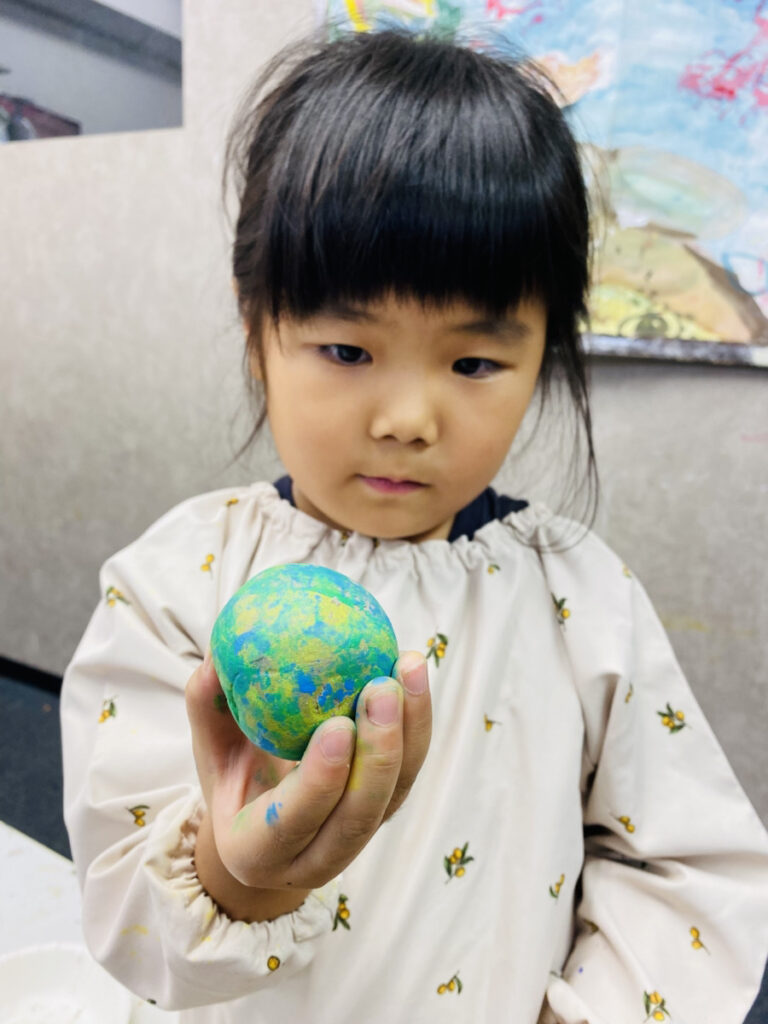 月や火星など実際にある惑星や、まだ発見されていない未知なる惑星まで色や模様を考えながらアクリル絵の具でペイントしました!みんなそれぞれ異なる美しい惑星どろだんごが完成しました!▼