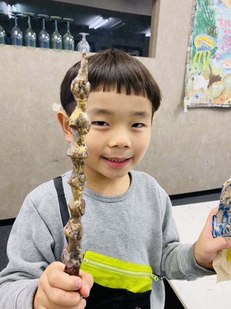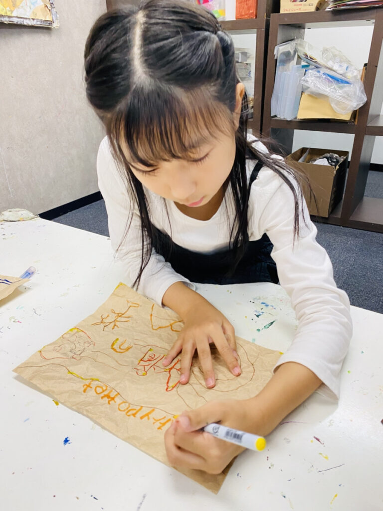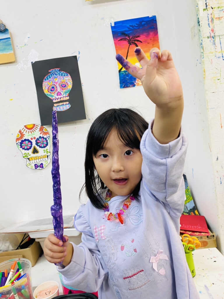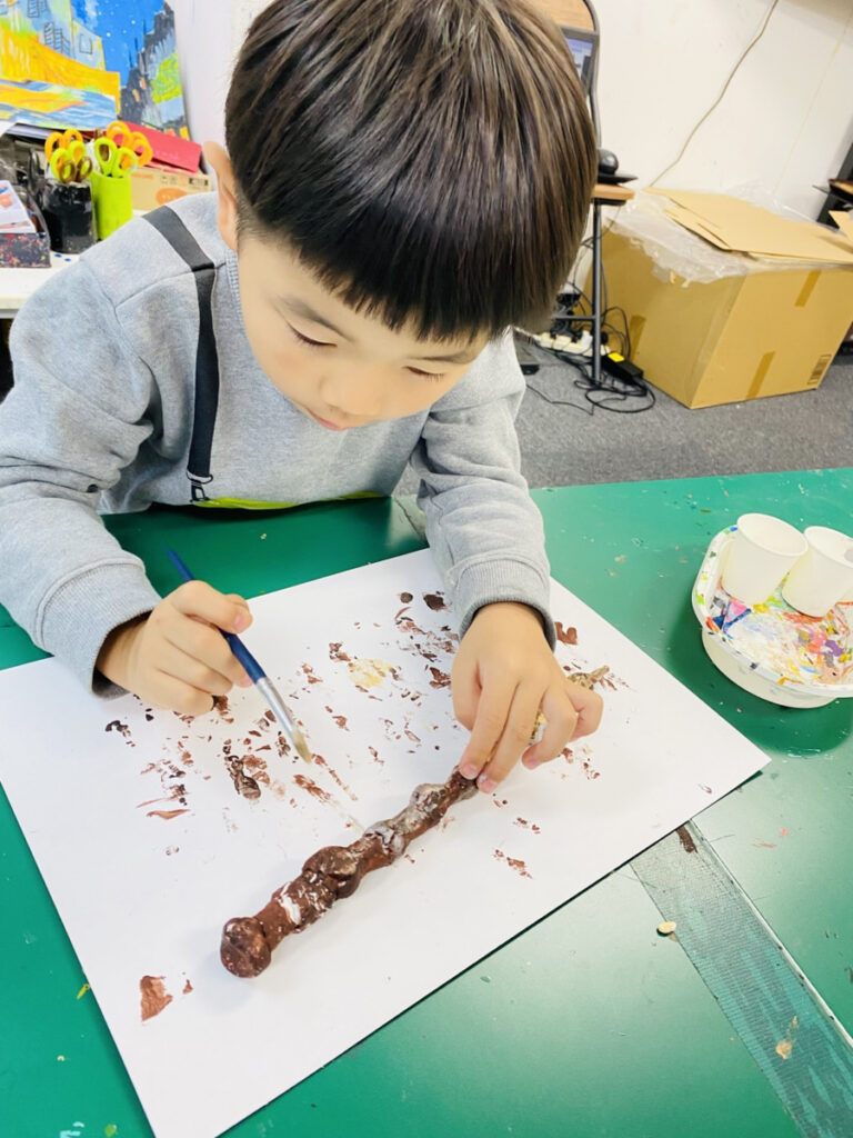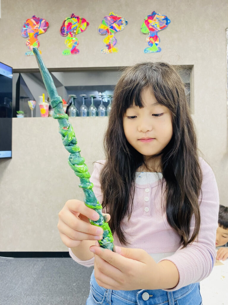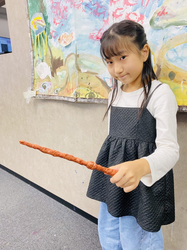 今回質感にこだわり固まると石のように固くなる「石粉粘土」を使用しました。どんな杖にするかイメージしながら菜箸に肉付けし、木の質感はアイス棒や箸を使って表現しました!アクリル絵の具で着色し、リアルな魔法の杖が完成です!魔法の地図も考えて描いてみましたね!ハリーポッターの登場人物になりきってぜひご自宅やおでかけにも魔法の杖を楽しんでください!▼