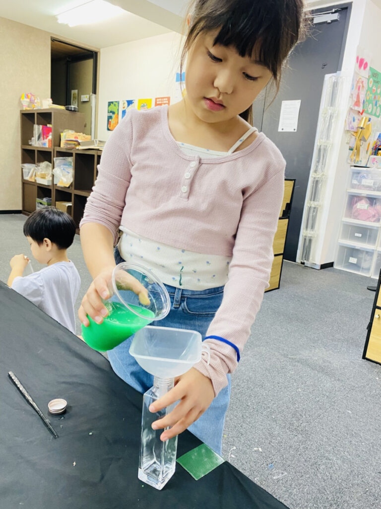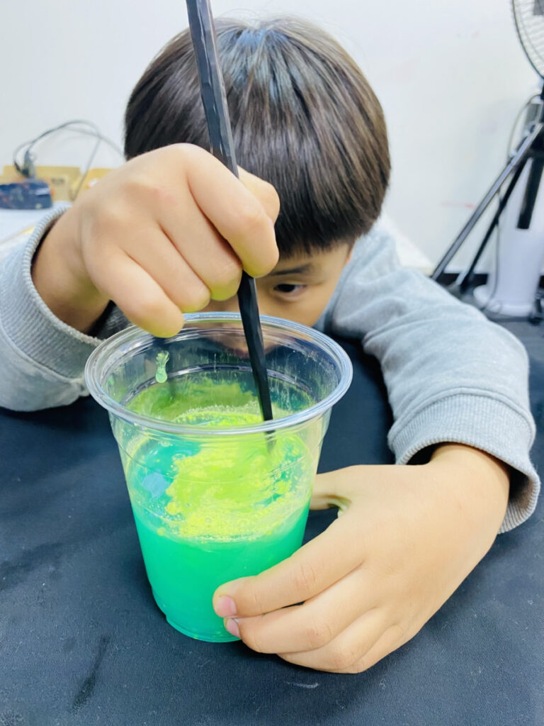 ハリーポッターにも登場する「魔法薬(まほうやく)」ポーションと呼ばれる魔法の薬は、不可能を可能にするまさに夢のような薬!今回は生徒さんが魔法使いになりきって、「こんな効能があればおもしろいな!」を想像しながら暗闇で光る魔法薬をつくっていただきました!