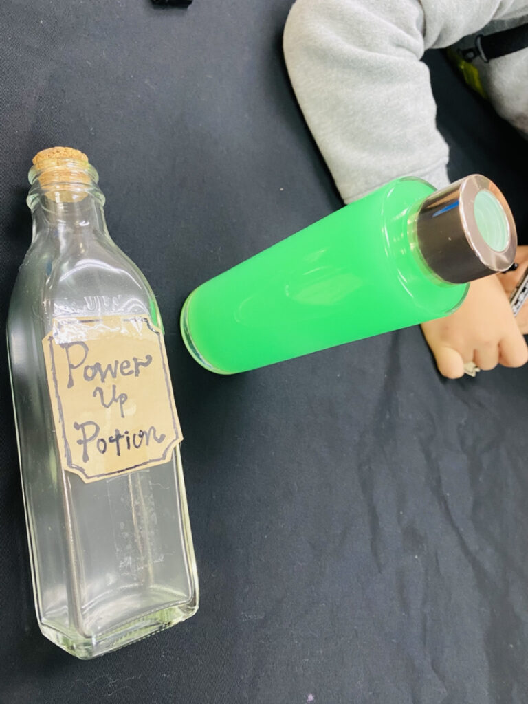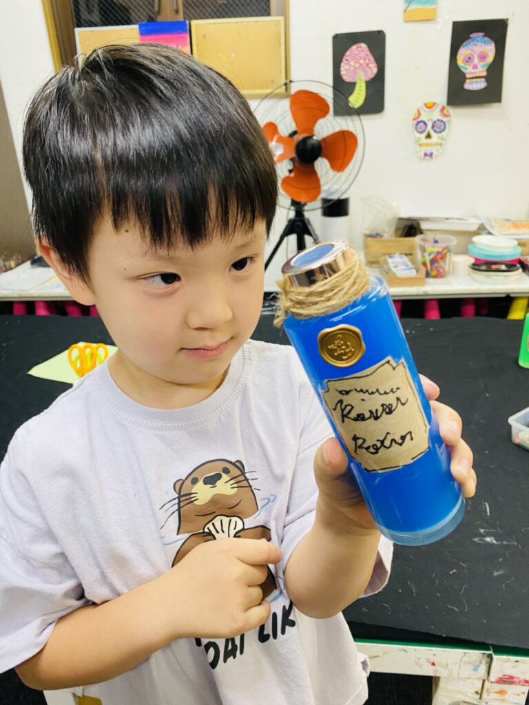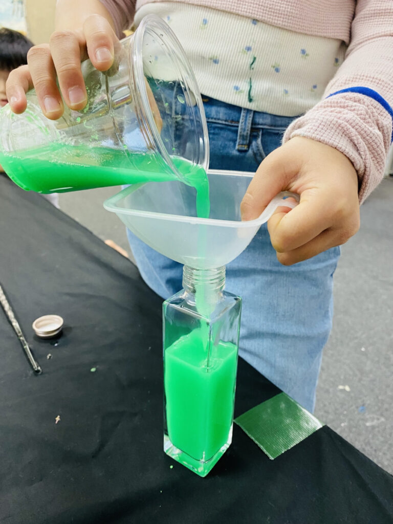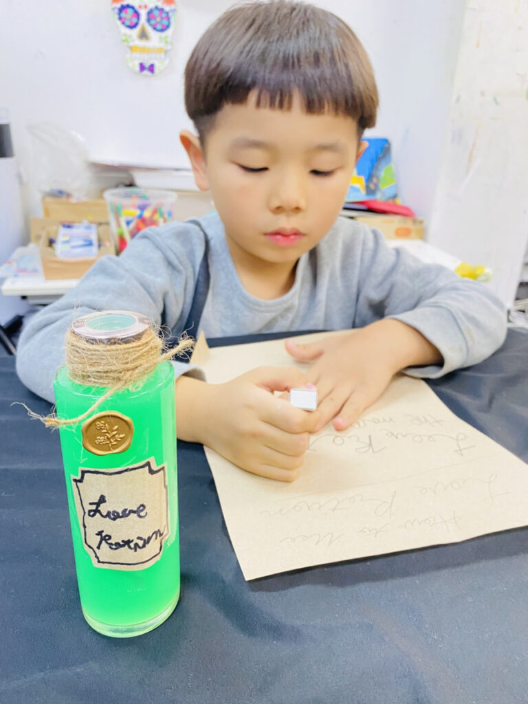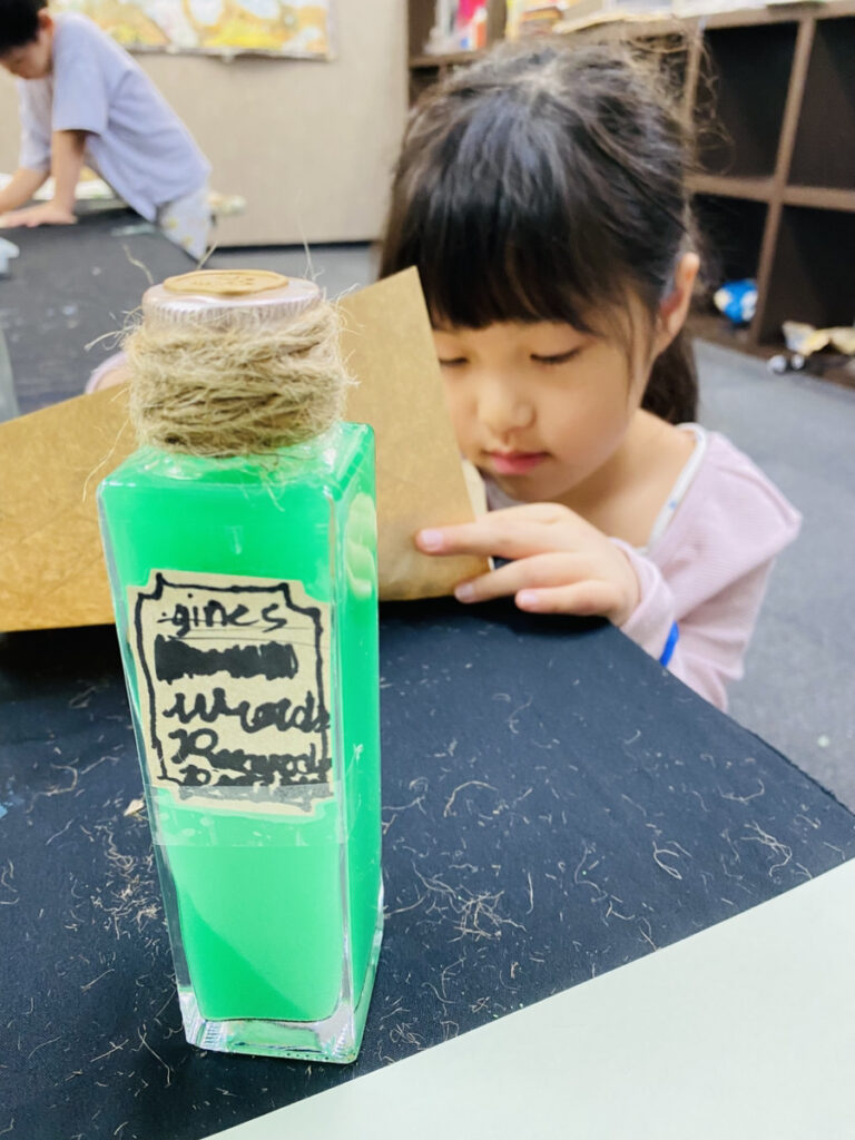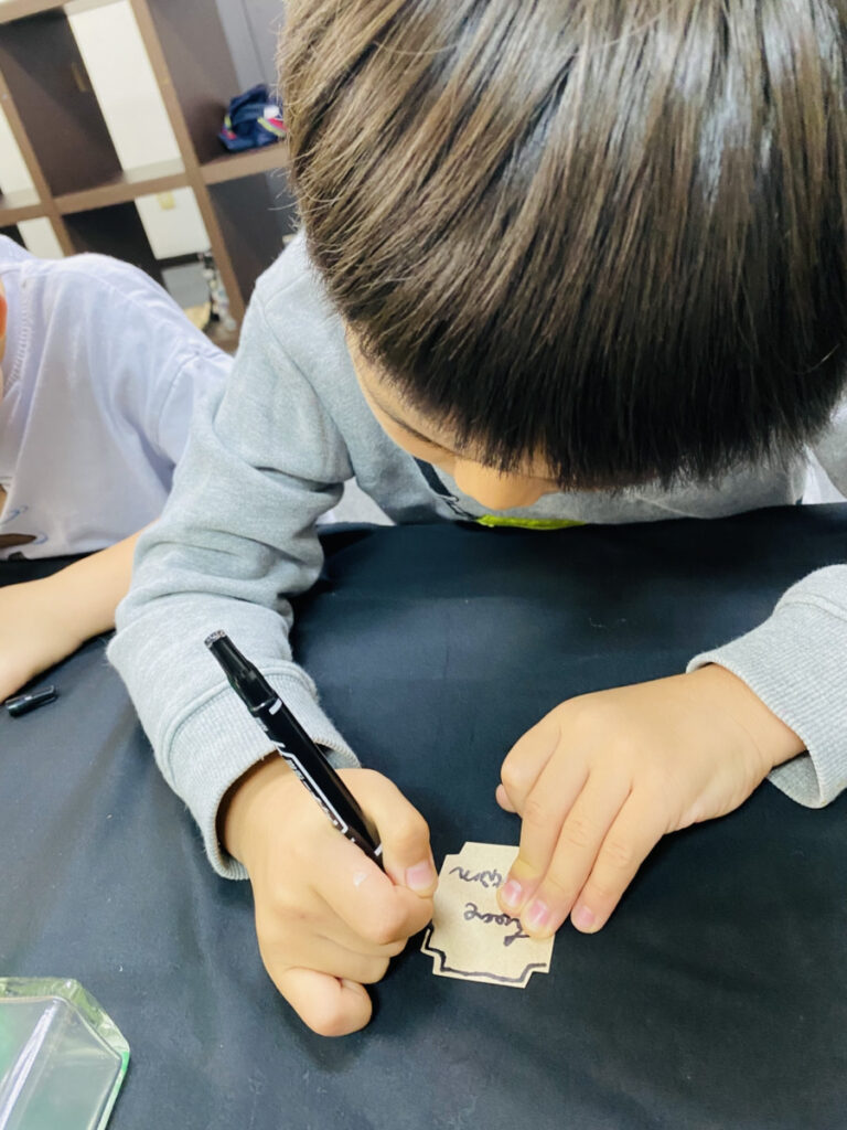 まずは魔法薬のとろとろ感を表現するため、洗たくのりを用意。水と食紅を加えて魔法の杖でよく混ぜます。(後ほど加える蓄光パウダーは水に溶けにくい為粘度のある洗濯のりを加えました)ここで蓄光パウダーを投入!しっかりと混ぜ合わせます。ボトルにもこだわりました!魔法薬のラベルは英語のライティングに挑戦!ここで生徒さんオリジナルの効能を考えます!「世界記録が達成できる魔法薬」「力が湧き出る魔法薬」など面白いアイデアがうまれました!ラベルに描いてビンにはりつけます!