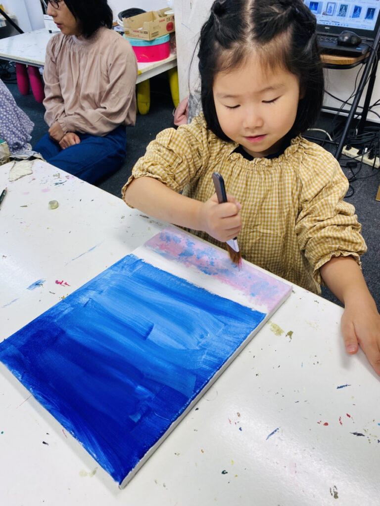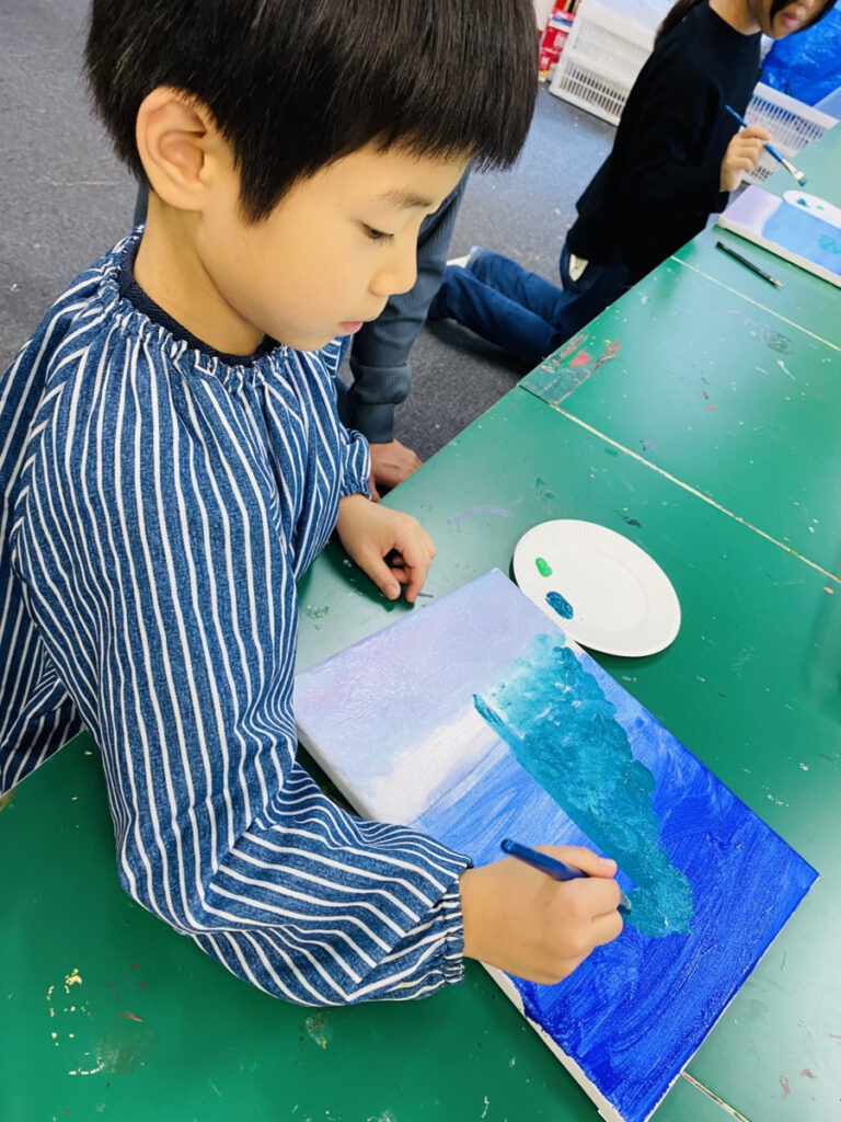 クリスマスを先取り!クリスマスツリーのある美しい雪景色をキャンバスに描いてみます!まずは背景の夜空をグラデーションにペイントし、雪のつもった地面もピンクや水色を混ぜることで雪の陰影を表現いただきます。ツリーは深緑と黄緑を組み合わせ平筆を使って葉っぱの質感をイメージしながら描きます。最後に細筆で星やでオーナメントを描きみなさんそれぞれ個性の光るクリスマスツリーが完成しいました!ぜひご自宅に飾ってクリスマスをご家族で楽しんでいただければ嬉しいです!▼