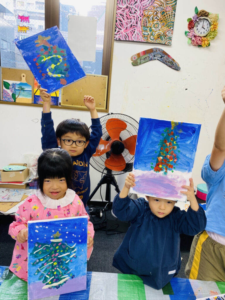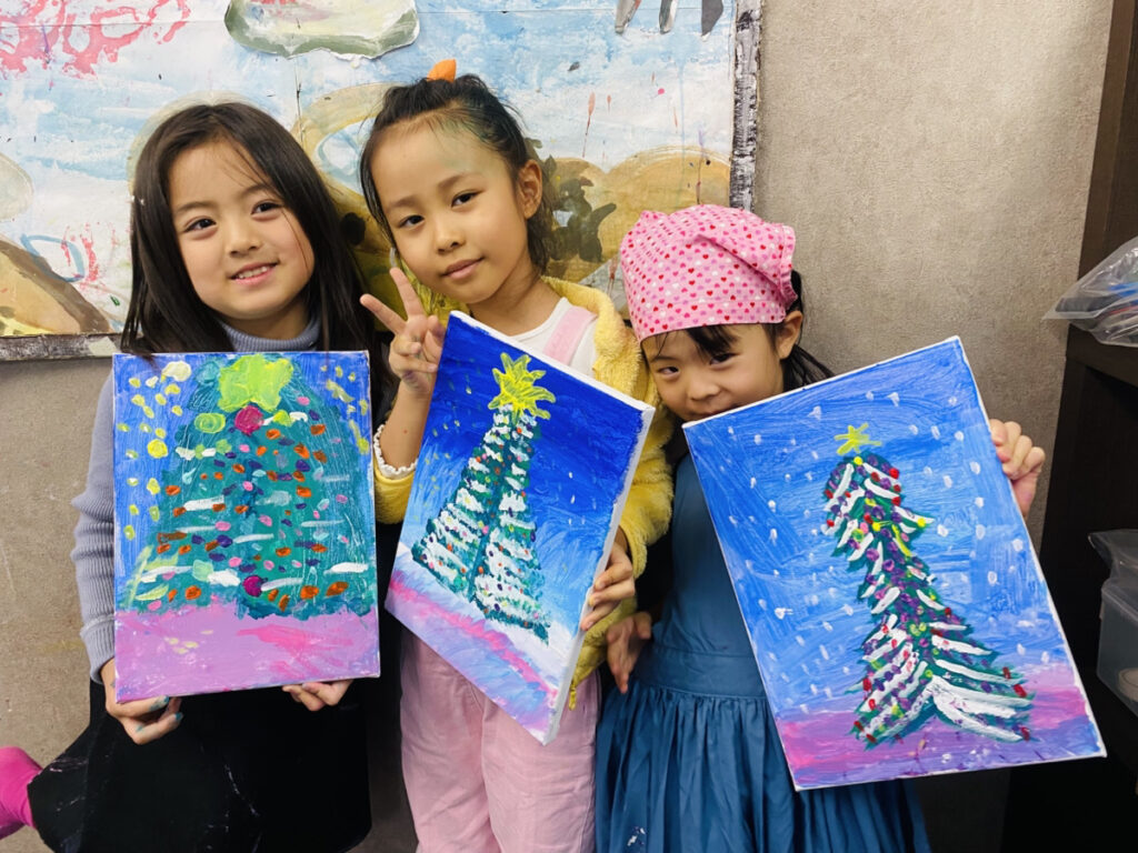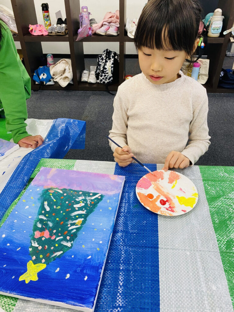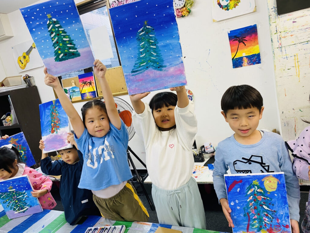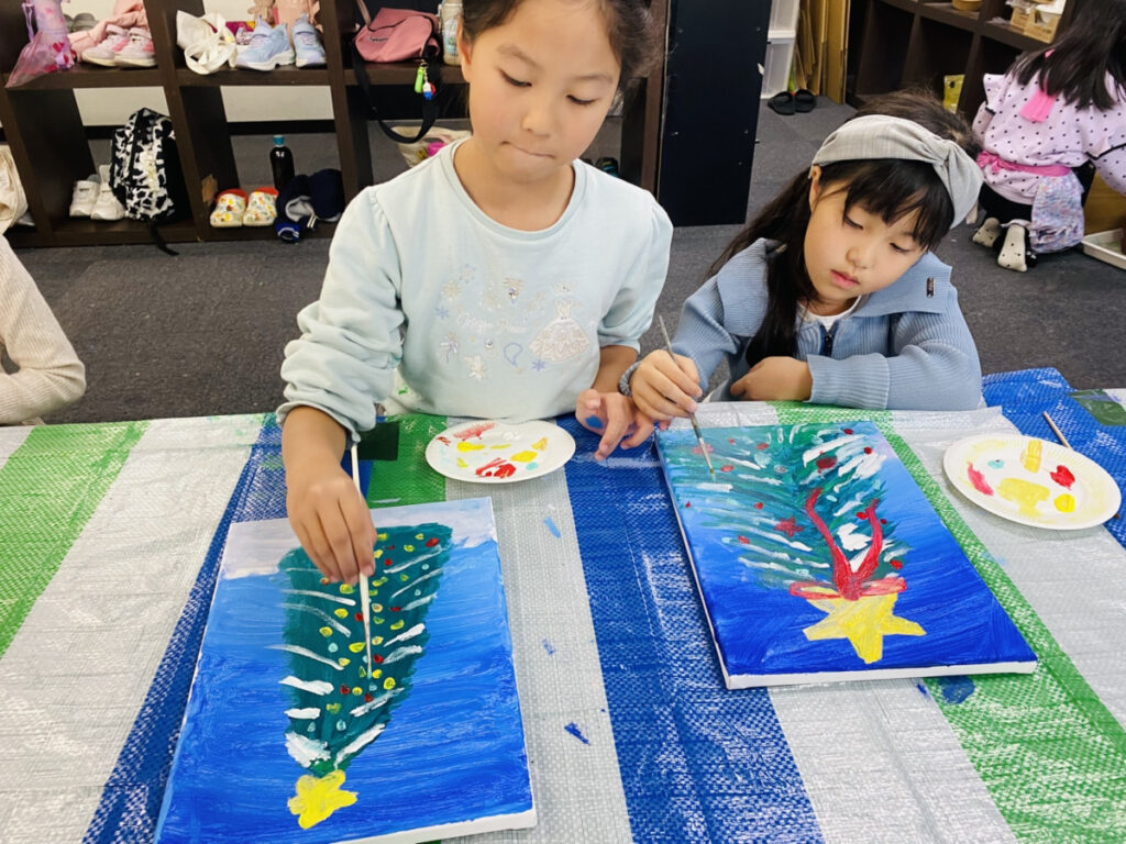 クリスマスツリーをキャンバスに描いてみよう!子供たちでも簡単なアクリル絵の具画の描き方をお教えしました!