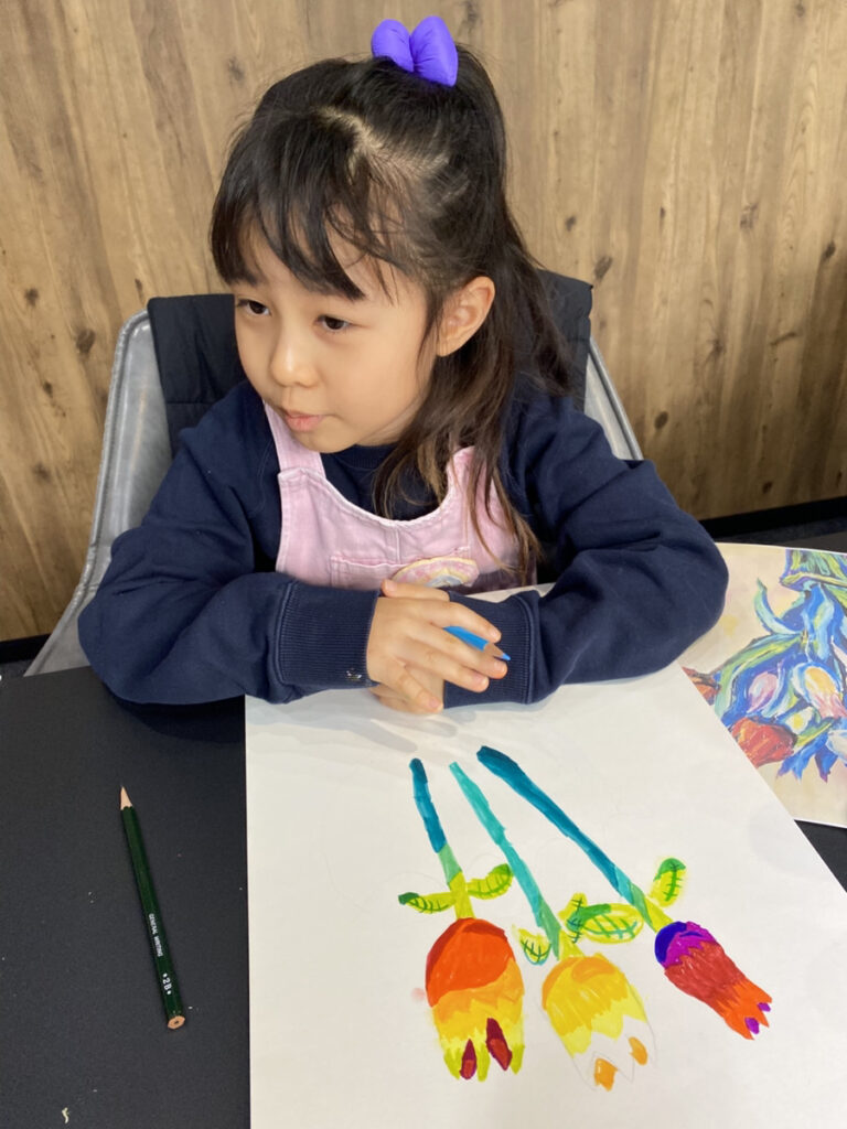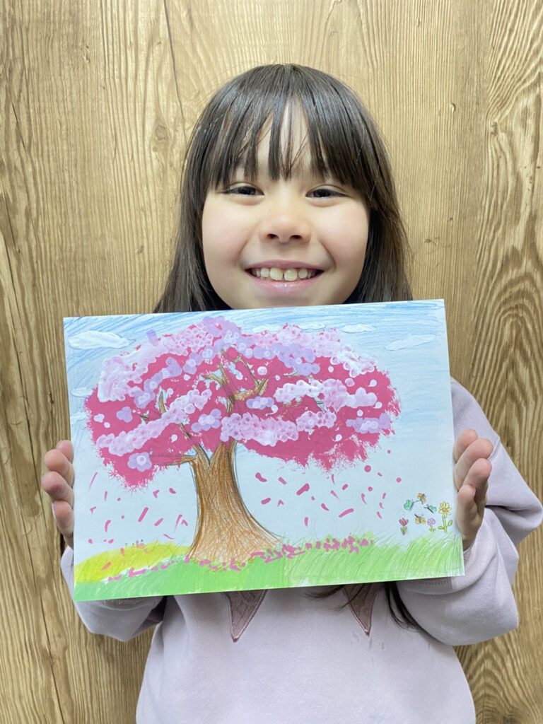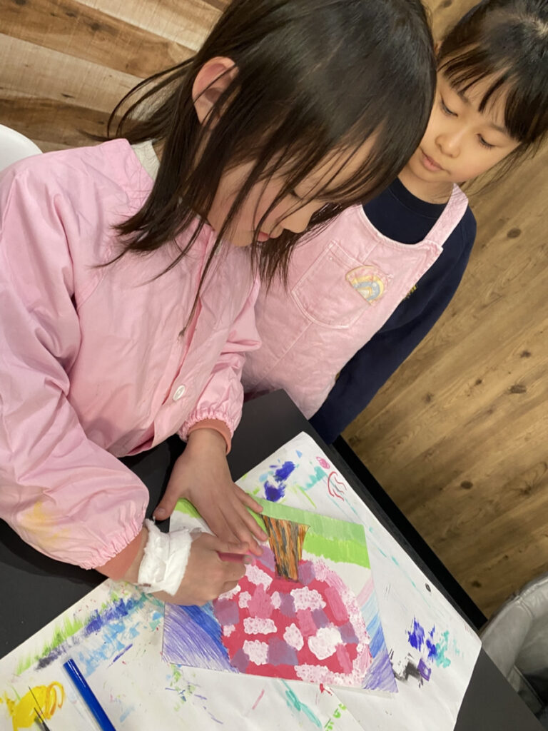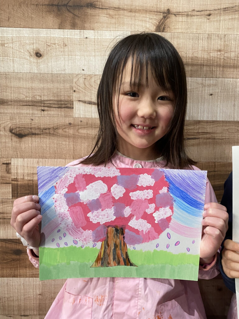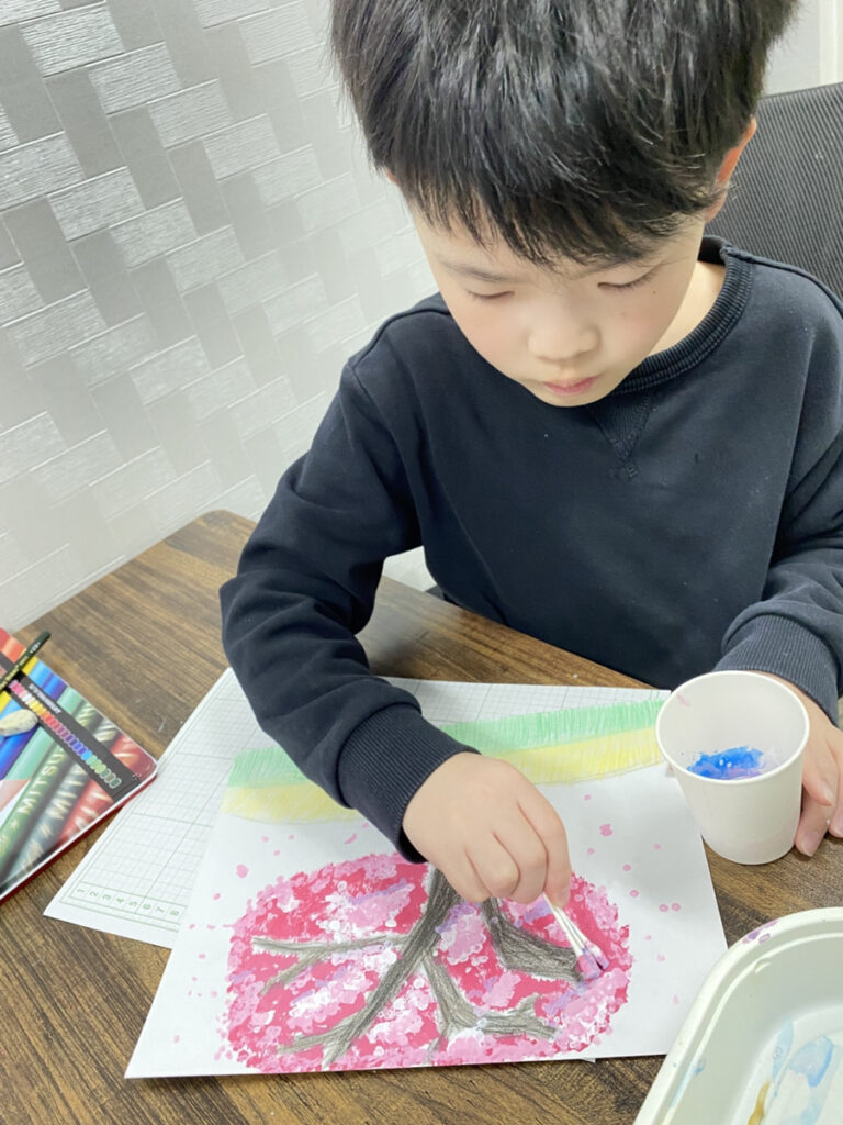 桜の花は、濃いピンク・薄いピンク・白・薄紫の色を使い、濃淡を考えながら重ねていきます。色を少しずつ変えながら描くことで、奥行きのある満開の桜が表現されました。