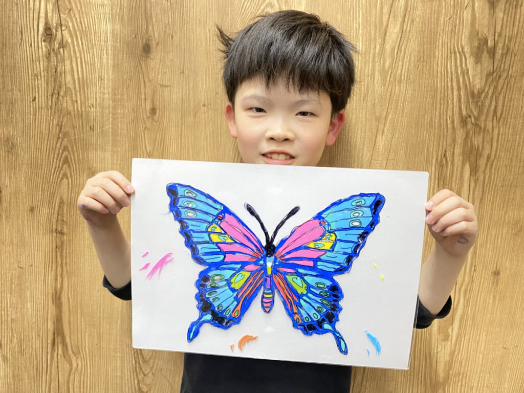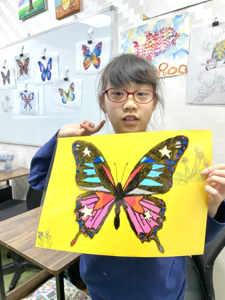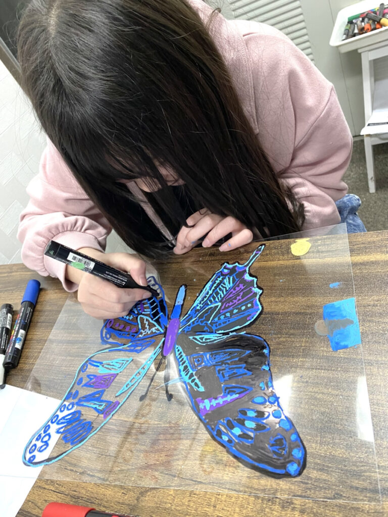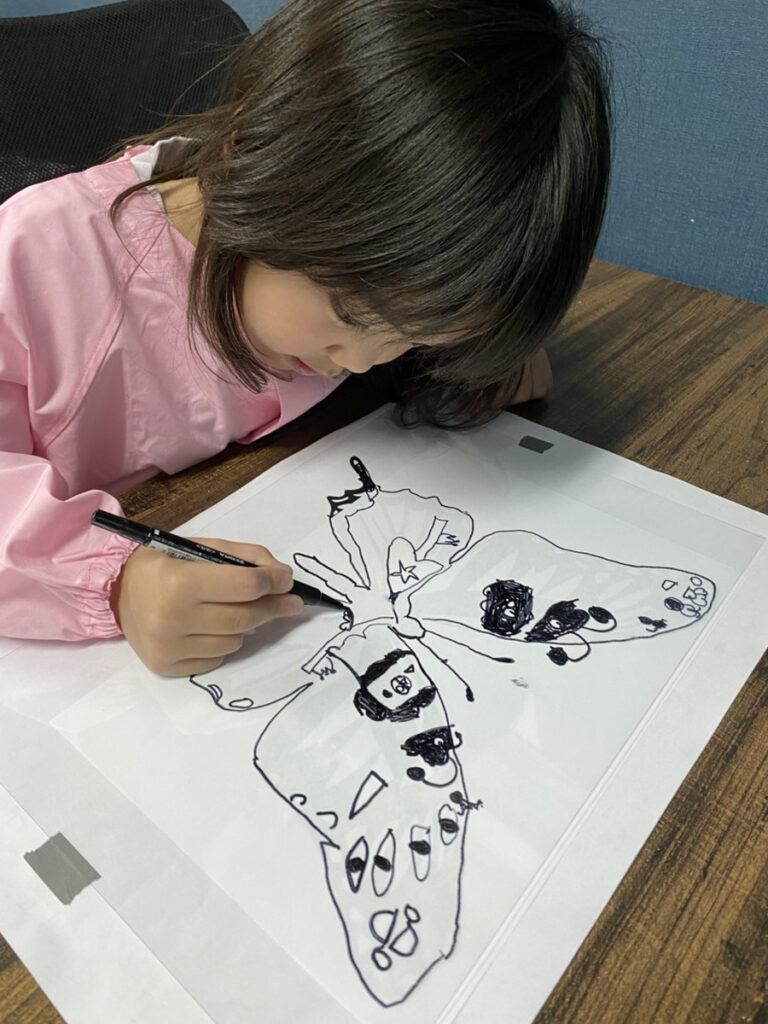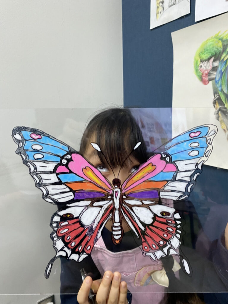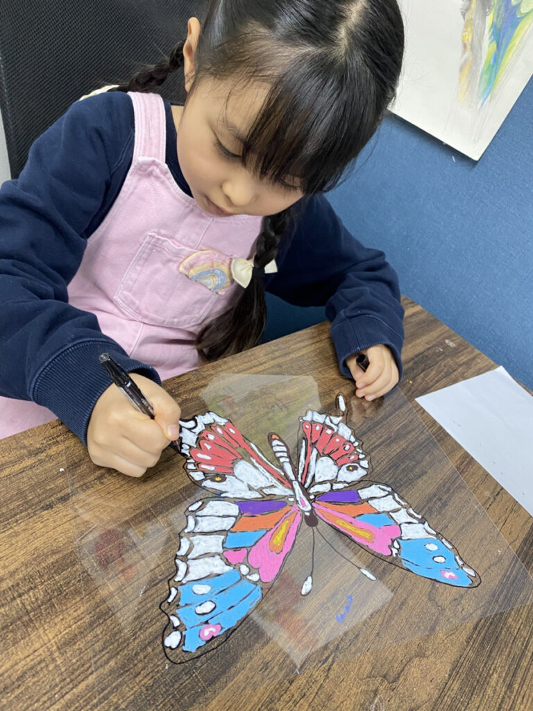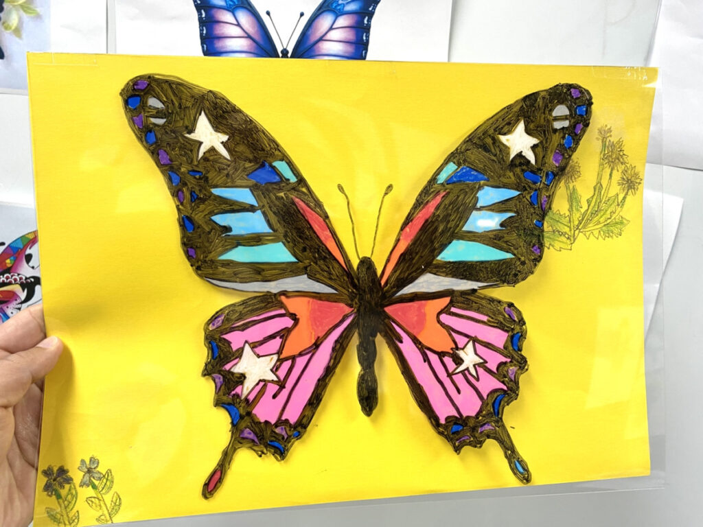 制作では、透明シートと背景を組み合わせるセル画のような手法を取り入れ、奥行きや重なりを感じられる表現に。ハートや星型、波模様など、思い思いのモチーフを蝶の羽に落とし込み、自由な発想でデザインを仕上げていきました!