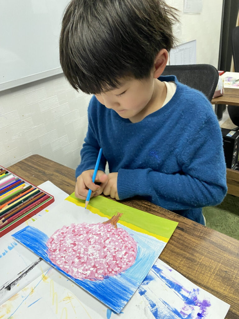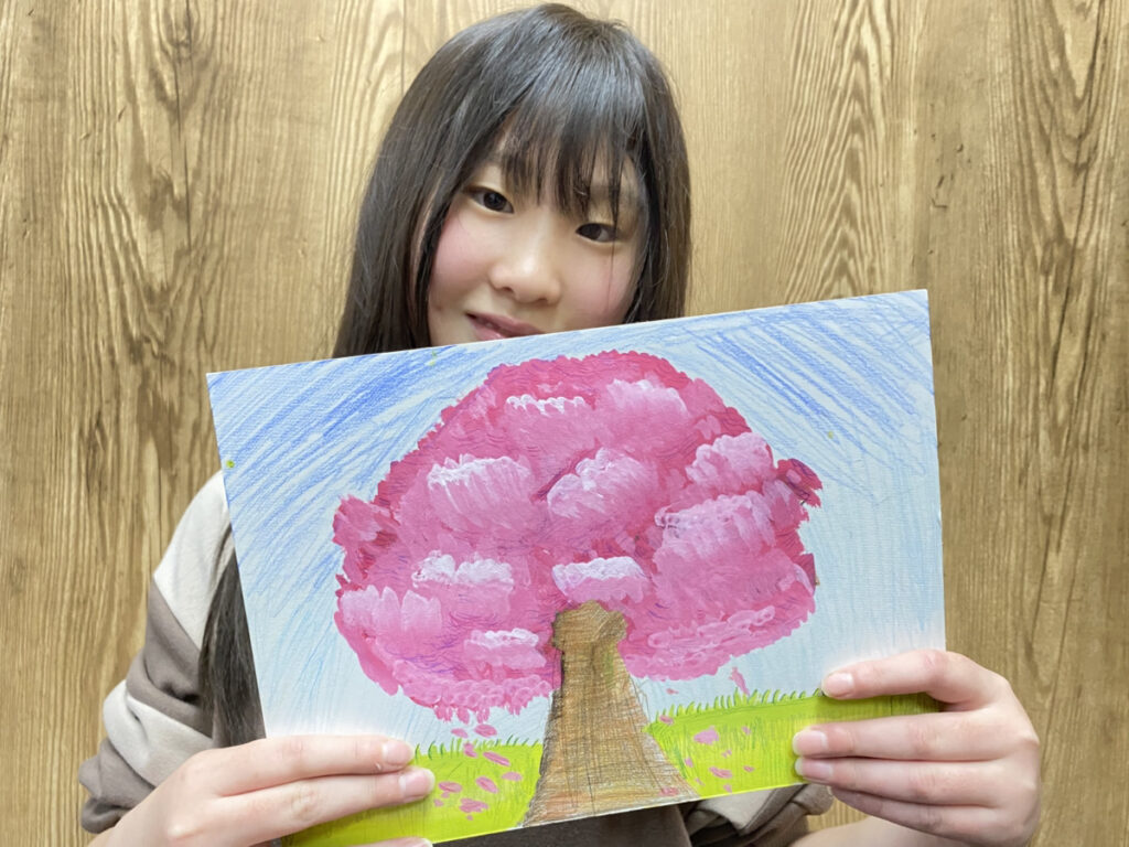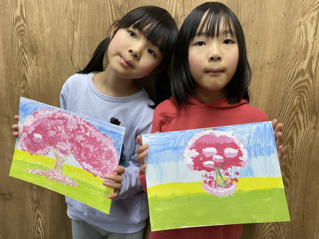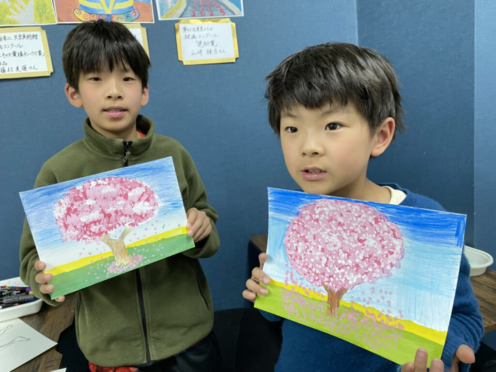子どもたちそれぞれの感性が光る作品となり、教室いっぱいに春のやわらかな空気が広がりました。同じテーマでも一つとして同じものはなく、個性豊かな桜の風景が完成しています。