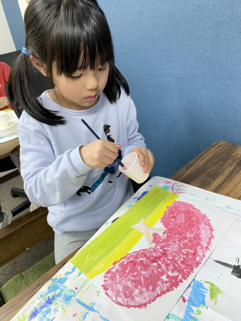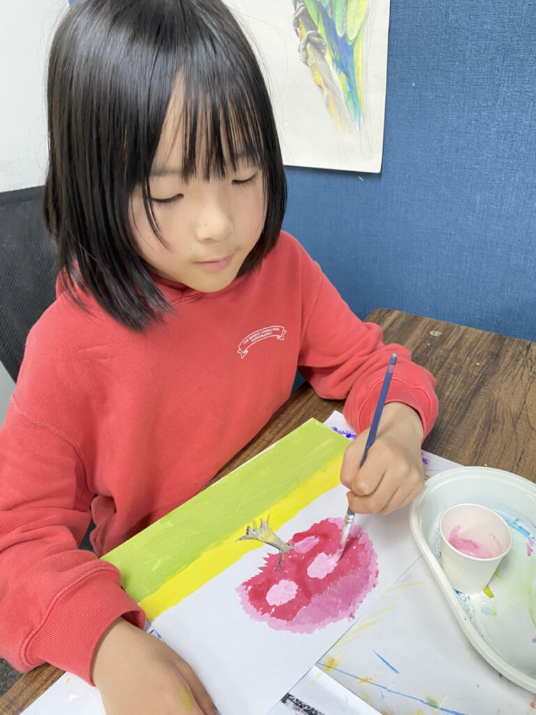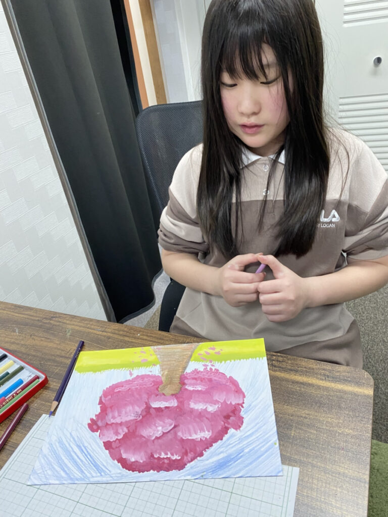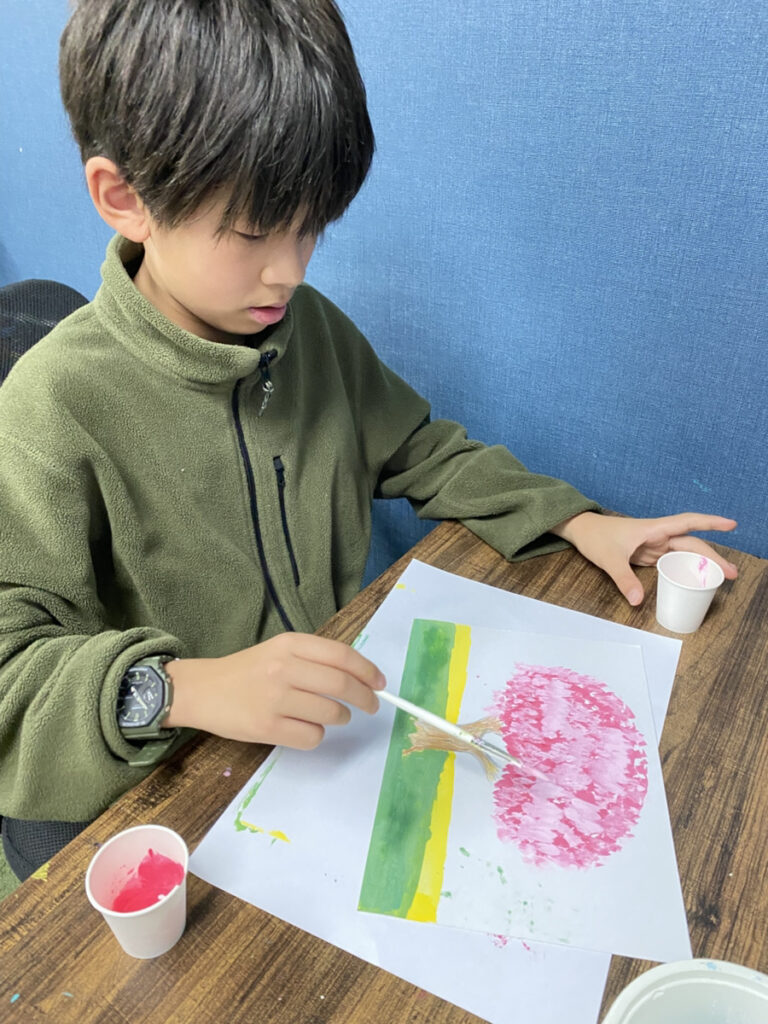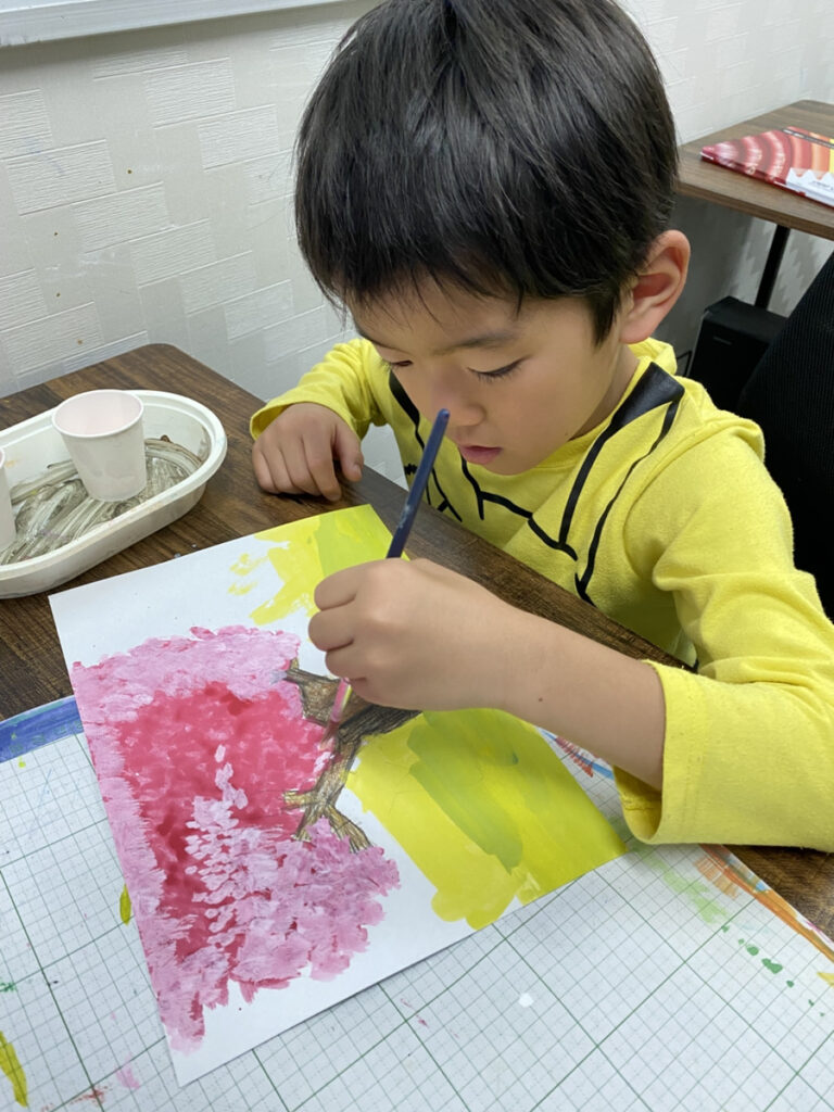 子どもたちそれぞれの感性が光る作品となり、教室いっぱいに春のやわらかな空気が広がりました。同じテーマでも一つとして同じものはなく、個性豊かな桜の風景が完成しています。