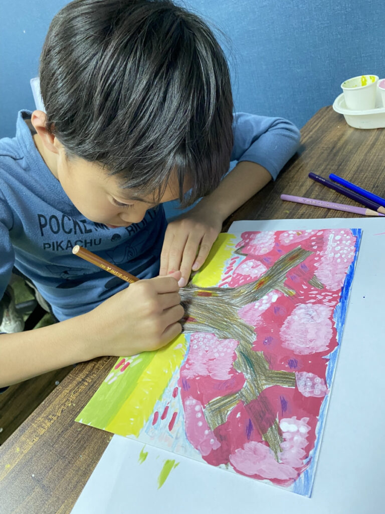 春をテーマに桜の木の絵画を制作中です!色鉛筆で幹や枝を描く工程からスタートしました。木のしなやかな動きや広がりを意識しながら、それぞれが思い思いの形で桜の木を表現。一本一本の線に個性が表れ、同じモチーフでも全く異なる印象の下絵が完成しました。
